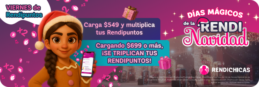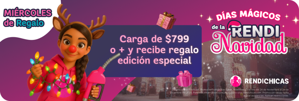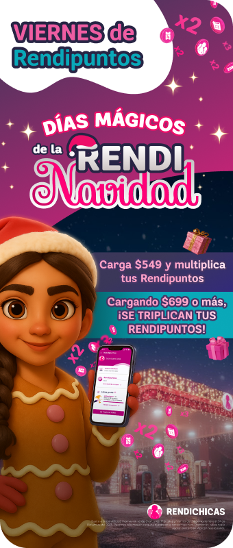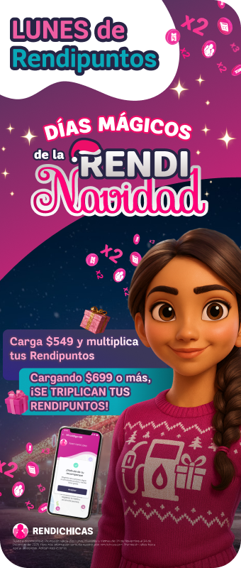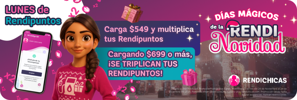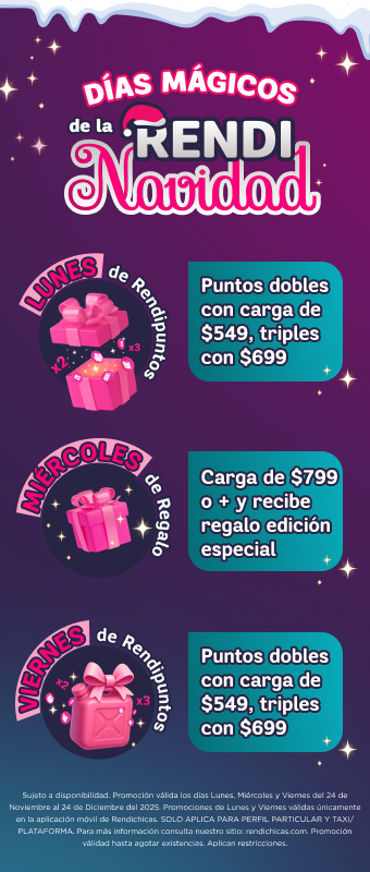 Sujeto a disponibilidad. Promoción válida los días Lunes, Miércoles y Viernes del 24 de Noviembre al 24 de Diciembre del 2025. Promociones de Lunes y Viernes válidas únicamente en la aplicación móvil de Rendichicas. SOLO APLICA PARA PERFIL PARTICULAR Y TAXI/PLATAFORMA. Para más información consulta nuestro sitio: rendichicas.com. Promoción válidad hasta agotar existencias. Aplican restricciones.