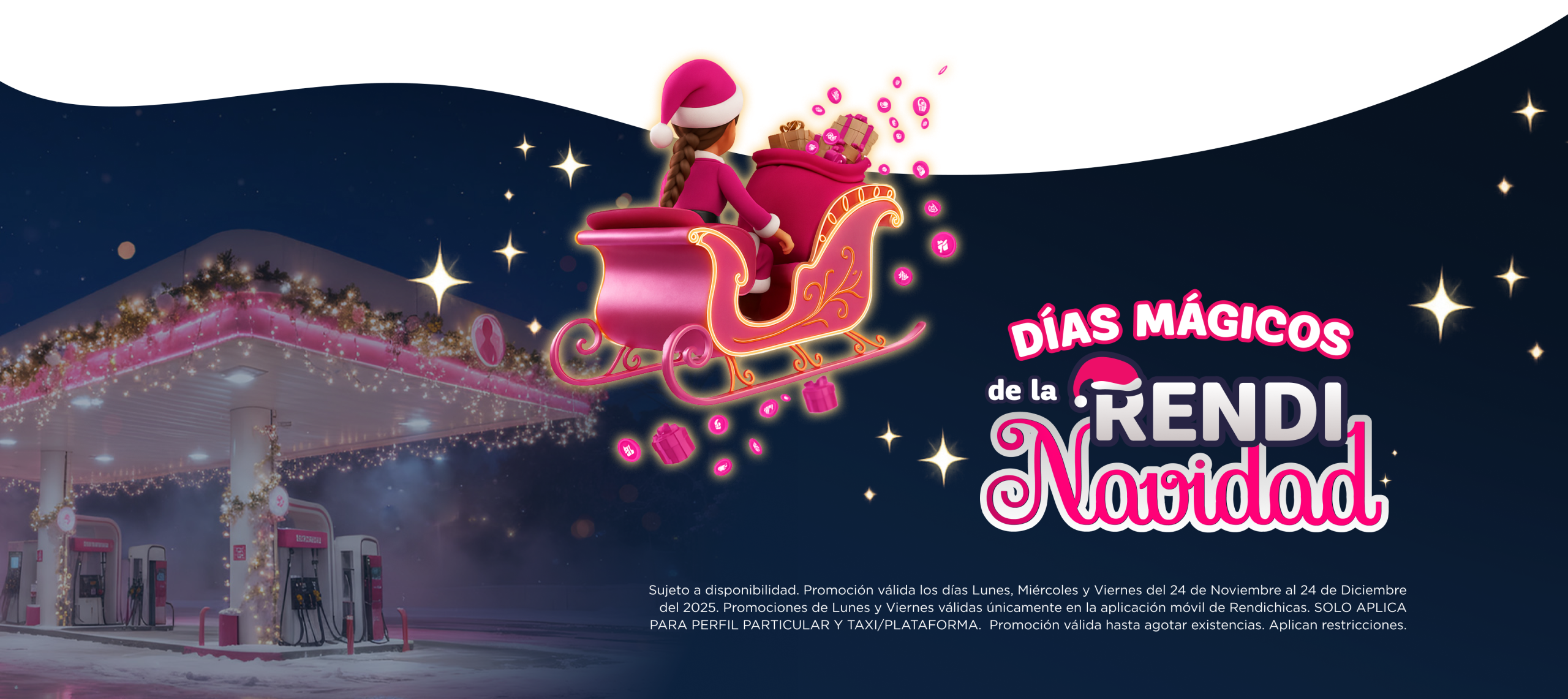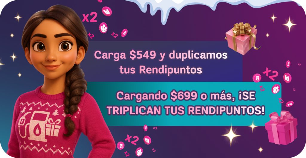 Sujeto a disponibilidad. Promoción válida únicamente los días lunes del 24 de noviembre al 24 de diciembre de 2025 en estaciones participantes. Al cargar $549 y utilizar la app Rendichicas al momento de la carga, obtienes rendipuntos dobles. Al cargar $699 o más y utilizar la app Rendichicas al momento de la carga, obtienes rendipuntos triples. Promoción válida hasta agotar existencias. Aplican restricciones.