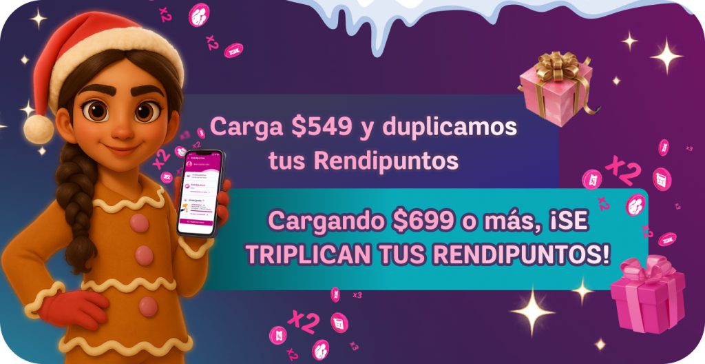 Sujeto a disponibilidad. Promoción válida únicamente los viernes del 24 de noviembre al 24 de diciembre de 2025. Al cargar $549 y utilizar la app Rendichicas al momento de la carga, obtienes rendipuntos dobles. Al cargar $699 o más y utilizar la app Rendichicas al momento de la carga, obtienes rendipuntos triples. Promoción válida hasta agotar existencias. Aplican restricciones.
